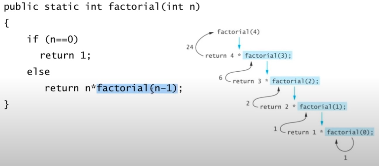 - n = 0이 되면 1을 return 하는 것을 시작으로 차례차례 return하여 최종적으로 main 메서드에 1 * 1 * 2 * 3 * 4 = 24를 반환하게 된다.