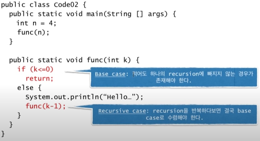 - Recursion case : 계속해서 자기 자신을 호출하는 reursion 코드