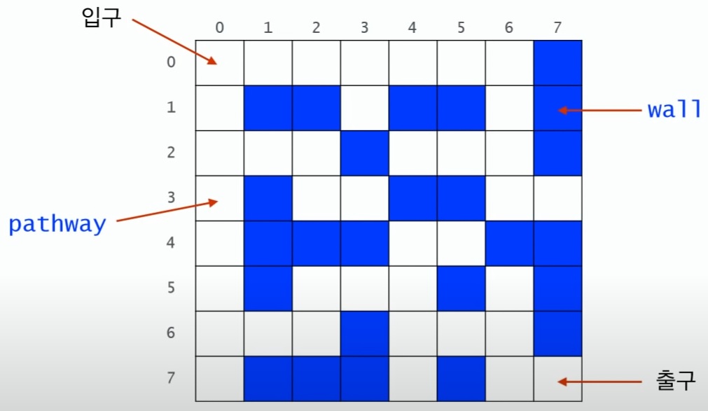 - 입구는 (0, 0), 출구는 (N-1, N-1)이며, 입구에서 시작해서 출구로 빠져나올 수 있도록 경로를 찾는다.