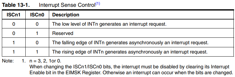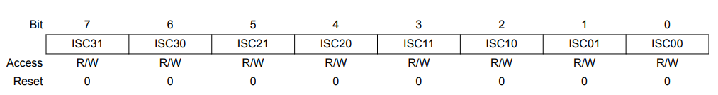 - EICRA Register : 외부 인터럽트의 동작을 제어하기 위해 해당 레지스터를 사용하며, 외부에서 설정한 인터럽트를 감지하게 되면 현재 작업을 수행을 멈추고, ISR (Interrupt service routine) 영역으로 제어권을 넘겨 해당 작업을 수행하게 된다. ISR 영역의 작업을 모두 수행하고 난 뒤, 다시 제어권을 반환하게 된다.