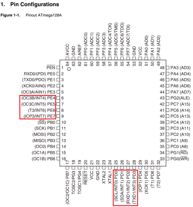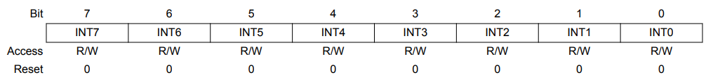- EIMSK Register : 이 레지스터는 Pin configurations를 보고, 어떤 Port 어떤 핀에서 Interrupt 신호를 인가할 수 있는지 확인하여 해당 핀에 연결한다. 그리고 EIMSK Register를 통해 연결된 핀에 맞게 각 비트값을 설정해주게 되면 해당 인터럽트가 활성화하게 된다.