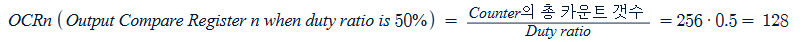 이번 구현에서는 Duty ratio를 50%로 정했기 때문에 그에 따른 OCRn 값은 다음과 같다.