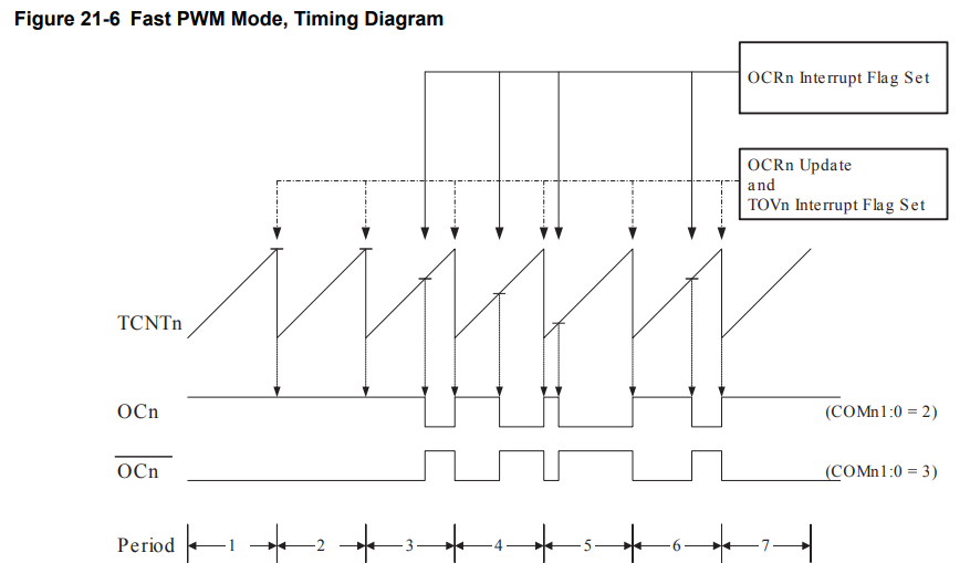 즉, Fast PWM Mode는 두 번의 Interrupt (= Output Compare Match Interrupt와 Overflow Interrupt)를 발생하며, 두 번의 Interrupt에 대해서 OCn(= Output Compare signal)은 Toggle을 발생 시킨다.