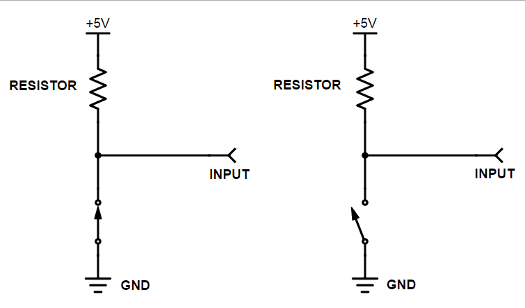 - 하지만, 버튼을 누르면 Vcc와 GND가 회로적으로 연결되기 때문에 Vcc 전압이 버튼의 핀으로 가지 않고, GND로 향하기 때문에 버튼의 핀에는 0V 전압이 들어온다.