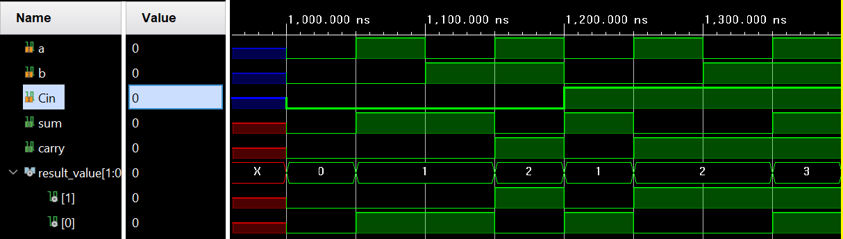 - sum, carry 출력 포트는 각 1bit이기 때문에 이를 모두 담기 위해서는 2bit 변수 크기가 필요하다.