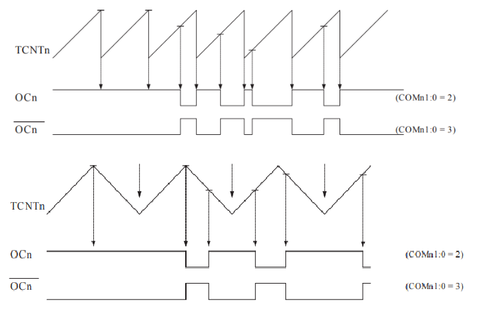 - Inverting mode : Upcounting에서 Interrupt 발생시, OCn을 1으로 Set 한다.