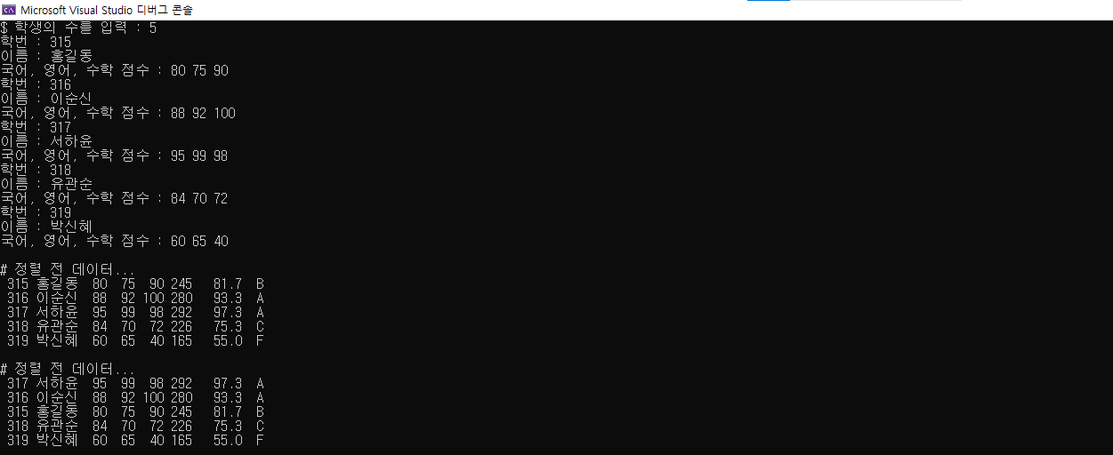 학생의 수를 입력 받은 뒤, 학생 수 만큼 국어, 영어, 수학 점수를 입력해 총점, 평균, 학점을 구하고 총점 순으로 정렬해 출력합니다. 학점은 평균이 90점이상이면 A, 80점 이상이면 B, 70점 이상이면 C, 그 외는 F로 평가합니다.