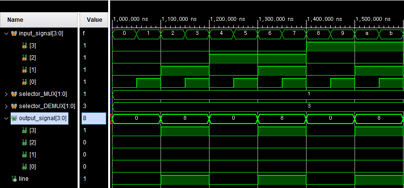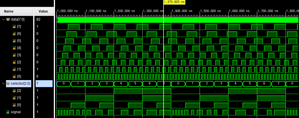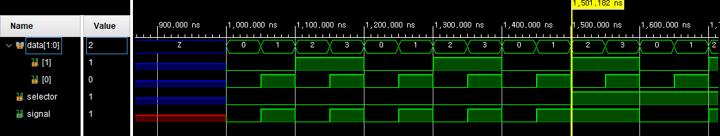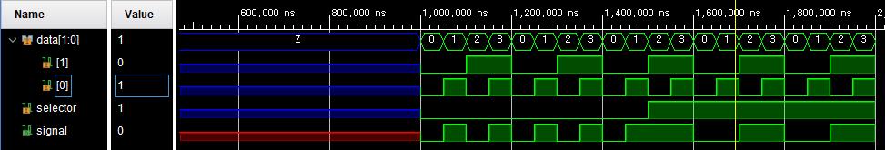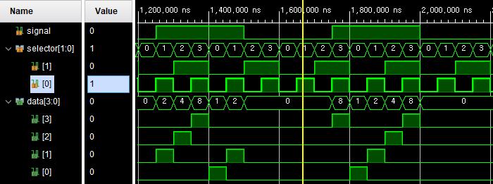 - selector가 1이면 data[1]이 출력값 (signal)에 그대로 나타난다.