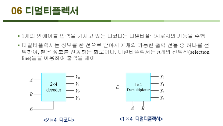 - DEMUX는 1개의 입력선으로부터 들어온 데이터를 출력으로 내보내기 위해 2^n개의 출력선 중 하나를 선택해야 하는데, 이를 선택선이 선택하게 된다.