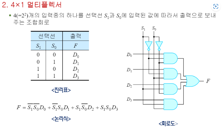- 2개의 선택선에 의해 4개 중 하나를 선택하여 들어온 데이터를 출력선으로 사용한다.