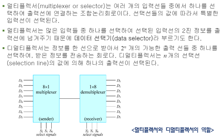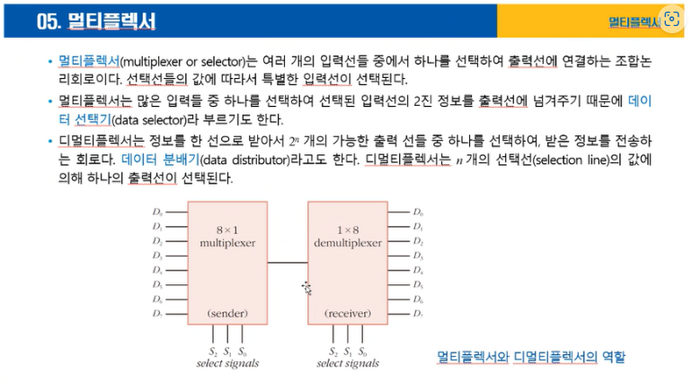 - 즉, 동시에 2^n개 입력 데이터가 들어오더라도 n개의 선택선에 의해 선택된 입력 단자만이 출력으로 전달된다.