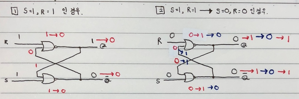 - Q) Q(t+1)와 bar{Q(t+1)}의 출력 값은 반대여야하기 때문에 S = 1, R = 1인 경우가 문제 인 것이냐?