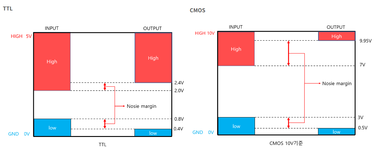 - 즉, 출력 전압이 입력으로 전달하는 과정에서 노이즈 및 손실로 인해 출력 전압 값이 변하더라도 이를 고려하여 정확하게 논리 레벨 값을 인식하기 위해 입력 전압 측에서 여유롭게 논리 레벨의 전압 기준을 준 것이다.