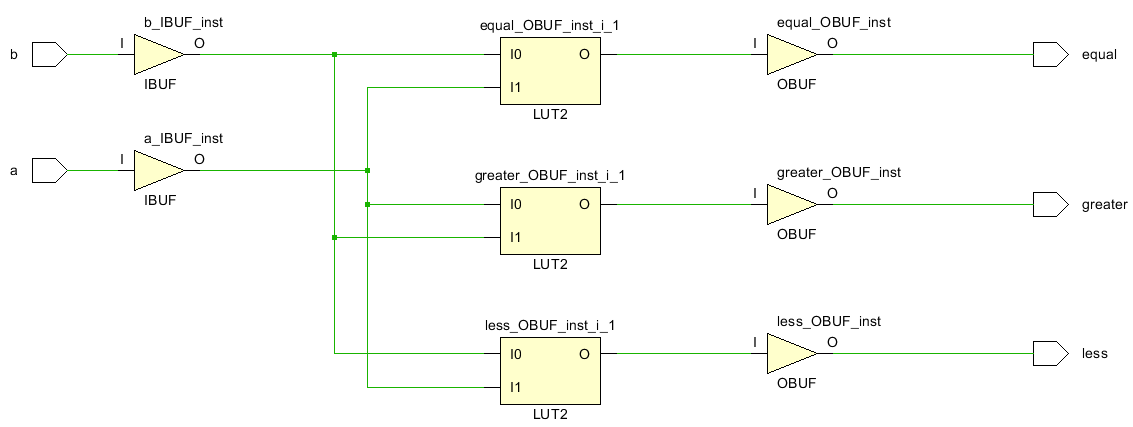 else if(a > b) begin equal = 0; greater = 1; less = 0; end