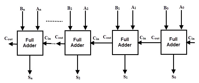 - 각각의 Full adder들은 각 비트에서 독립적으로 덧셈연산을 수행하며, LSB을 제외한 나머지 비트에 해당하는 Full adder들은 이전 비트에서 발생한 Carry 값을 받아 연산한다.