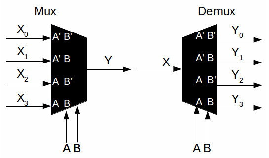 즉, 4개의 입력선으로부터 한 번에 여러 데이터가 들어오지만, 실제로 출력으로 나가는 입력 데이터는 X1으로 들어오는 데이터이다. - DEMUX는 4개의 출력선이 존재하지만, 실제로 입력 단자, X로 부터 들어온 데이터를 출력으로 나가는 출력선은 Y3이다.