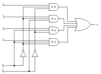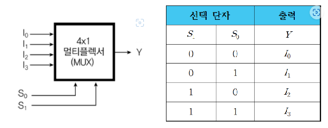 - 입력선은 I0 ~ I3까지 4개의 입력을 가지며, 4개의 입력선들을 통해 데이터가 들어오지만, 실제로 출력으로 나가는 값은 선택선 S1, S0에 의해 선택된 입력선으로 들어오는 데이터가 나간다.