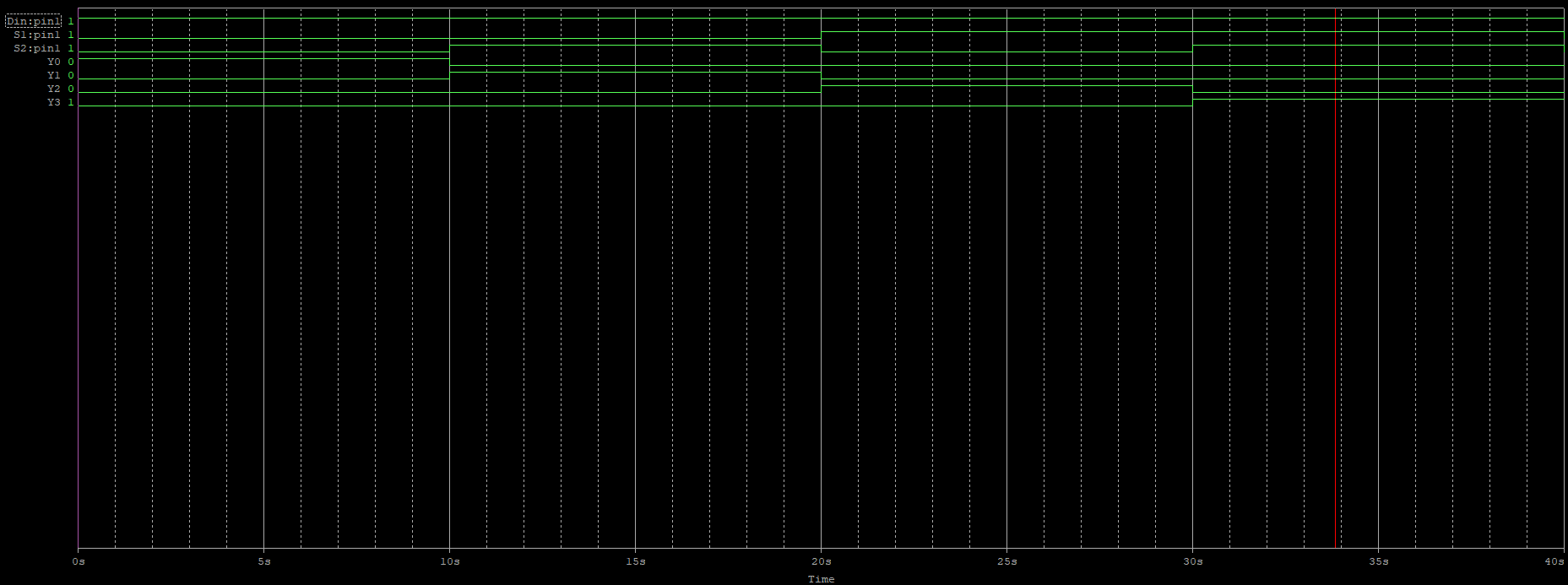 - 시뮬레이션을 통해 선택선 S0, S1에 의해 선택된 출력선으로 입력 데이터가 출력됨을 확인할 수 있다.