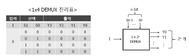 - DEMUX는 MUX와 반대로 여러 개의 출력선들 중에서 선택선에 의해 선택된 출력선으로 들어온 데이터를 해당 출력선으로 내보내는 조합 논리 회로이다.