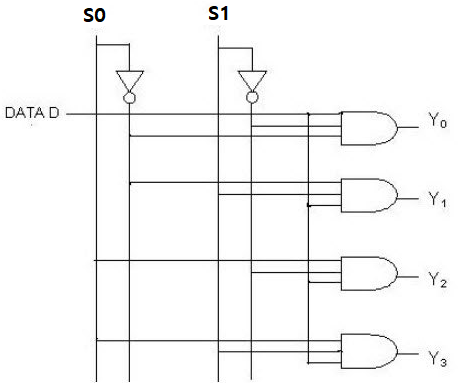 - 4개의 출력선을 갖지만, 선택선 S0, S1에 의해 선택된 출력선을 통해 입력 데이터가 출력된다.