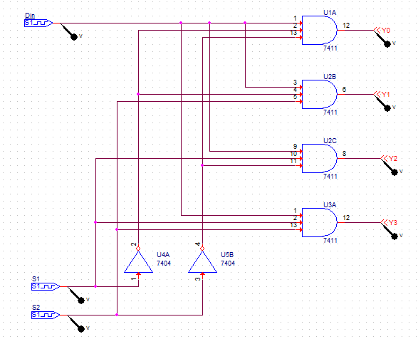 - PSpice를 통해 4출력 DEMUX의 논리회로를 설계한 뒤, 진리표와 동일하게 출력이 발생하는지 확인하자.