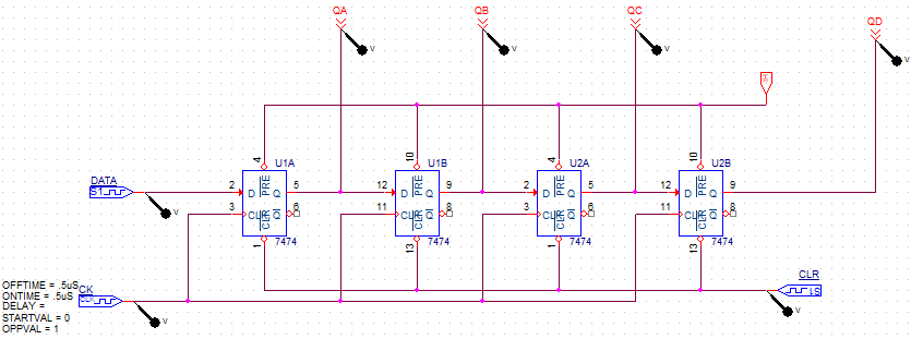 - Shift 연산을 수행하기 전, CLR (CLEAR) 단자의 입력값에 1을 입력하여 모든 Flip Flop의 출력 값을 0으로 초기화한다. → 초기화를 하지 않을 경우, QB, QC, QD는 각각 이전 Flip-Flop의 값을 받게 될 텐데, 이전 Flip-Flop 값들은 Unknown 상태이기 때문에 이를 방지하고자 초기에 0으로 초기화해준다.
