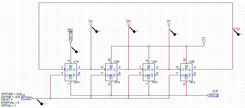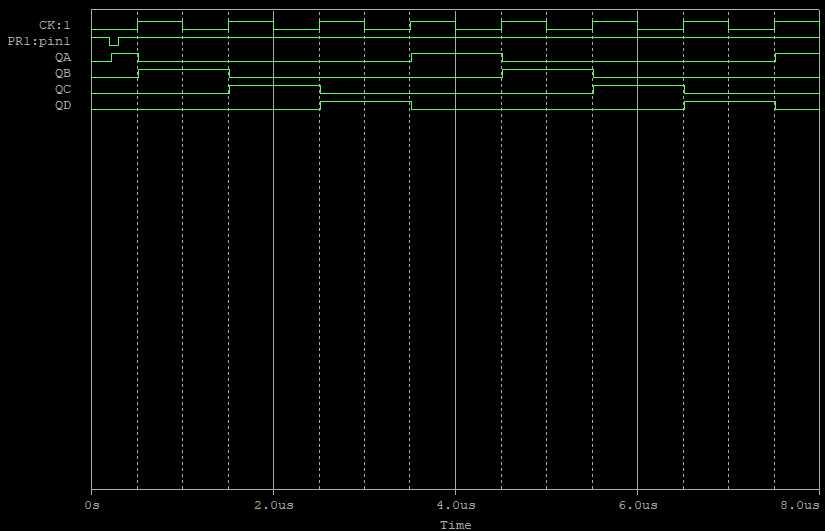 - 첫 번째 Flip-Flop 에 초기 값으로 1을 Set하기 위해 PR1 단자에 0.2us에서 0을 입력했다가 0.3us에 다시 1로 입력했다.