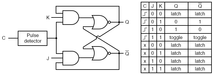 - JK Flip Flop은 다음과 같은 진리표와 논리 게이트 회로를 갖는다.