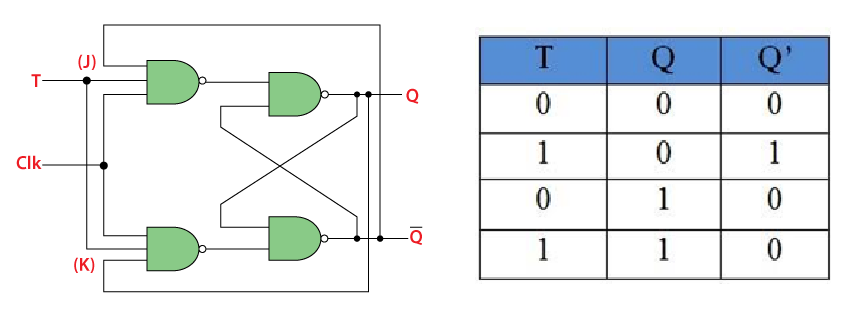 - T Flip Flop은 다음과 같은 진리표와 논리 게이트 회로를 갖는다.