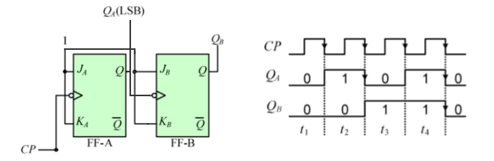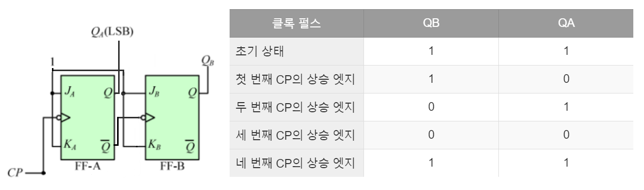 - 4진 카운터이기 때문에 2개의 JK Flip Flop으로 구성