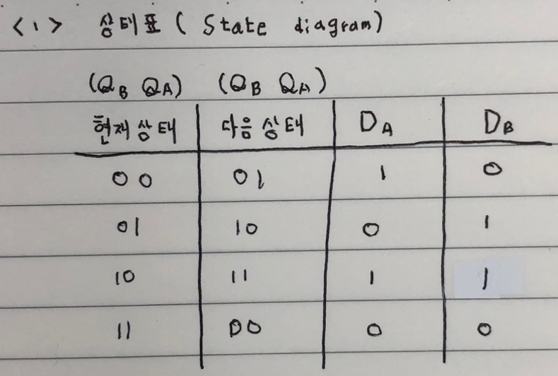 | 2 | Transition table 작성하기 | - (설계에 사용할) 플립플롭의 출력을 다음 상태로 바꾸기 위한 입력값을 표시한 천이표(Transition table) 작성하기 |