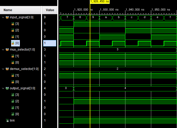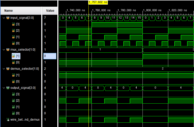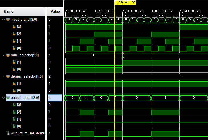 demux demux0 (wire_of_linking_between_MUX_and_DEMUX, demux_selector, output_signal);