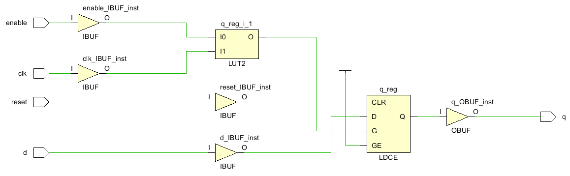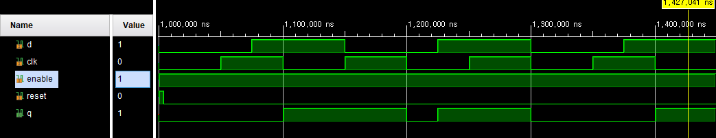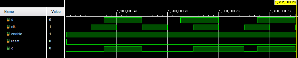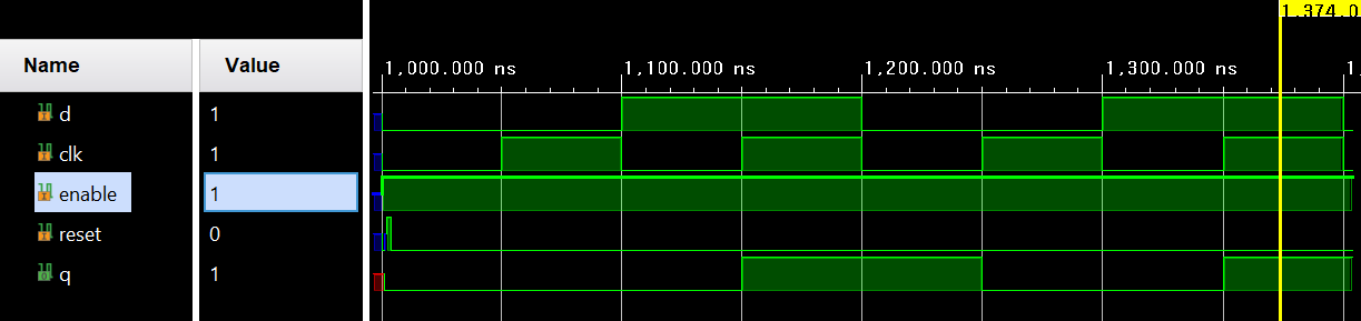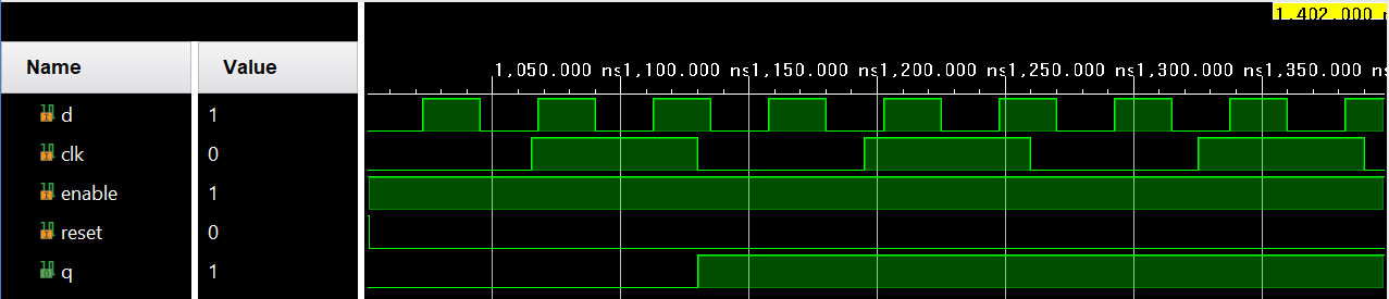 - clk = 1 인 경우, 출력 값, q(t+1)은 입력 값, d을 그대로 출력한다.