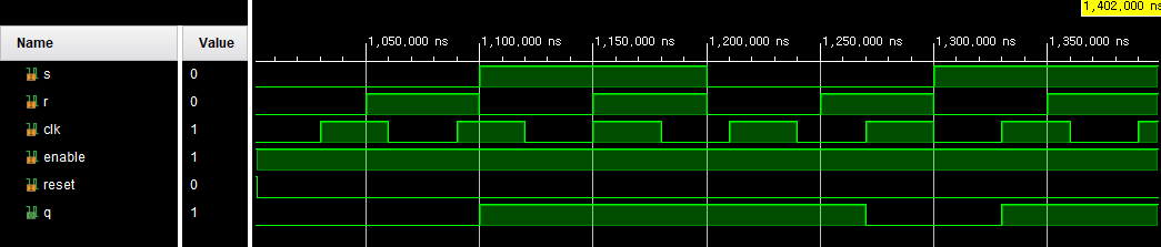 - clk = 1, s = 0, r = 1 일 경우, 출력 값, q(t+1)을 0으로 reset시킨다.