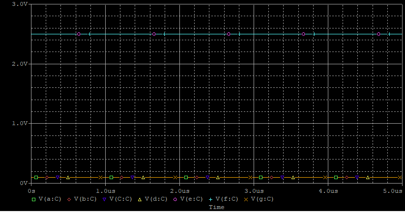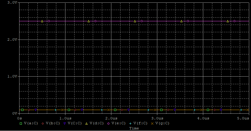 - 시뮬레이션을 통해 알 수 있듯이 e, f 핀의 cathode가 High 이기 때문에 해당 다이오드들은 문턱 전압을 극복하지 못하여 불이 들어오지 못한다.
