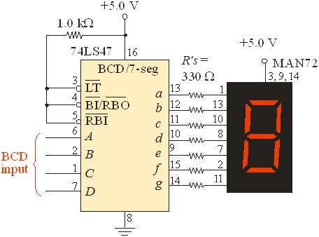- 1, 2, 6, 7핀은 BCD 코드 입력 단자이며, 6번 핀은 MSB이고, 7번 핀은 LSB이다.