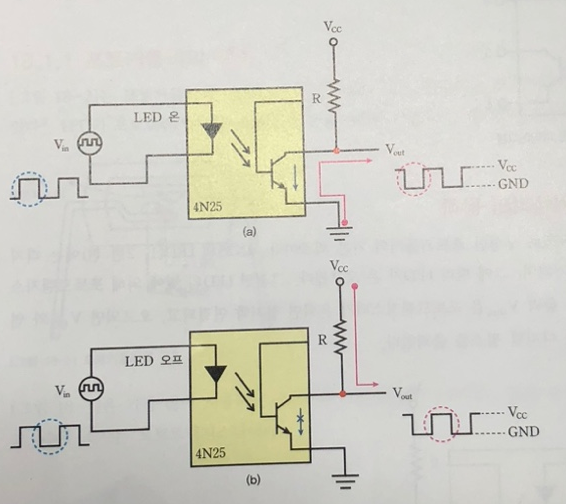 - Vin이 High일 경우, LED와 포토트렌지스터가 on되어 Vout과 GND가 연결되어 Vout = Low level 값을 갖는다.