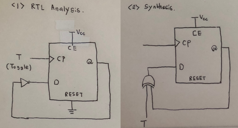 - Q) D Flip Flop을 통해 T Flip Flop을 구현하면 RTL analysis와 Synthesis 회로가 서로 다름을 확인할 수 있다.