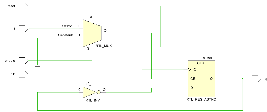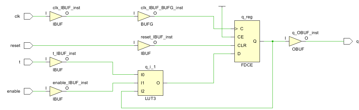 - 따라서 Vivado가 판단하기를 "D Flip Flop을 기반으로 T Flip Flop을 구현함에 있어 T와 Q를 XOR 하는 것은 NOT gate를 사용한 것 보다 효율적이다." 라고 판단한 것이다.