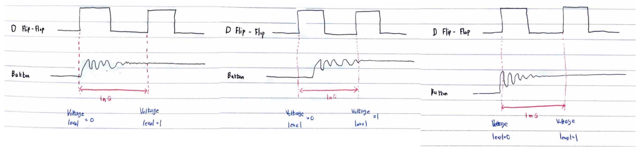 - D Flip - Flop이 충분히 Chattering 현상이 발생하는 시간보다 길다면 첫 번째 Positive edge에서 Button의 입력값으로 어떤 값을 읽었던 간에 두 번째 Positive edge에서 Button 입력값으로 1을 읽기 때문에 Chattering 현상으로 인해 Button의 레벨 값이 여러번 변화하는 문제를 해결 할 수 있다.