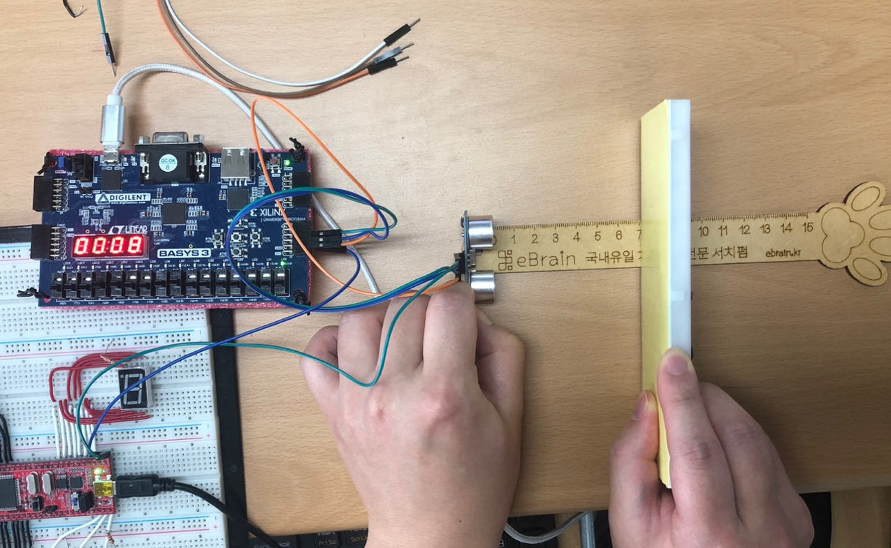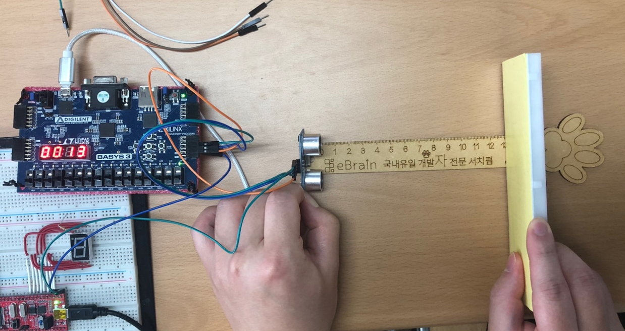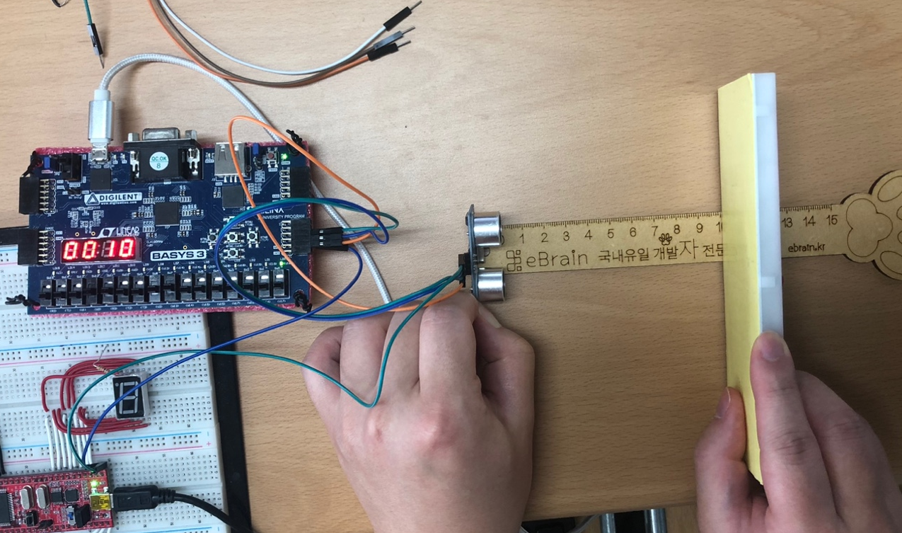 이처럼 수치적으로 HC-SR04로부터 언제 Echo Pulse를 받을지 모르기 때문에 가장 확실한 방법은 Echo Pulse의 Positive edge를 감지하도록 설계함으로서 Positive edge가 발생하면 HC-SR04로부터 거리의 데이터를 얻은 것이며, 반대로 Positive edge가 발생하지 않았다면 HC-SR04와 Basys3 간에 연결이 끊겼다고 생각하여 첫 단계인 S_IDLE 부터 다시 수행할 수 있다.