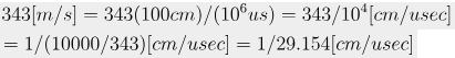 A) 초음파의 속도는 343m/sec이며, 이를 m/sec 단위에서 cm/usec 단위로 변환하면 1/29.154 [cm/usec]로 값이 변환된다. 그런데, 반사되어 다시 되돌아온 것이기 때문에 왕복인 점을 고려하여 나누기 2를 할 필요가 있어 최종적으로 58로 나누어 주게 된다.
