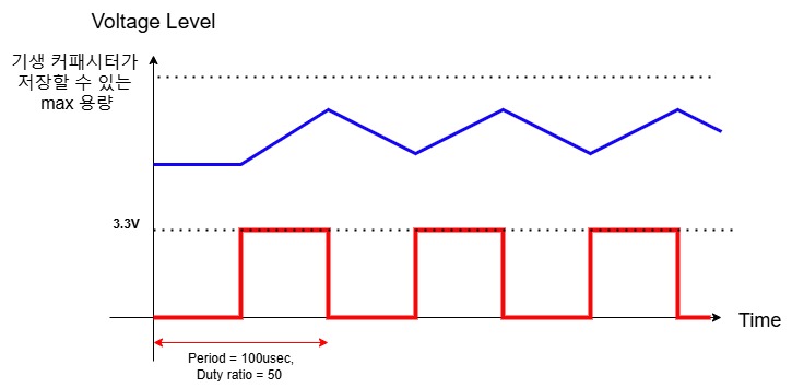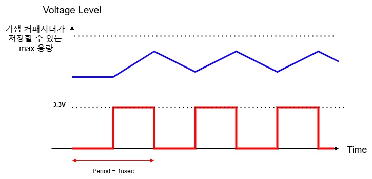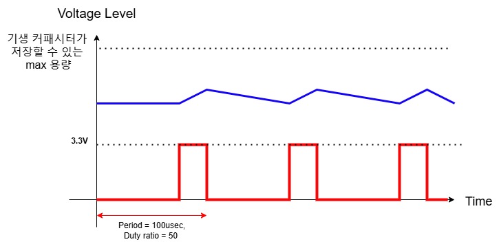- 하지만, 아래 그림와 같이 Pulse wave의 periode가 짧다면, 커패시터를 충전하는 시간도 그에 따라 짧아 질 것이다.