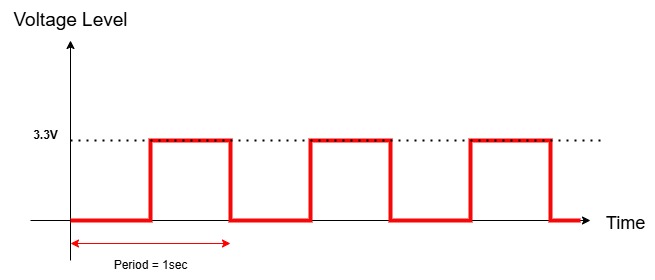 - 아래와 같이 주기가 1sec인 Pulse wave를 diode에 전달하면 0.5초 동안 diode가 꺼졌다가 0.5초 동안 diode가 켜졌다가를 반복할 것이다.