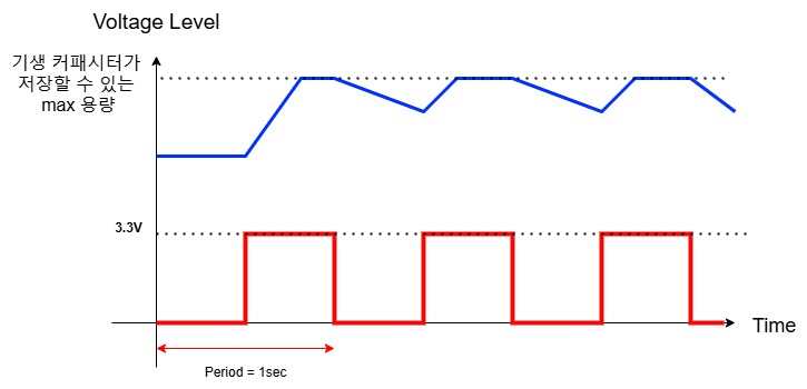 - 아래 그림에서 알 수 있듯이 주기가 1초일 경우, 0.5초 동안 Pulse wave가 활성화 되어 있기 때문에 해당 0.5초 동안 기생 커패시터는 다이오드에 흐르는 전류를 통해 충전이 될 것이다.