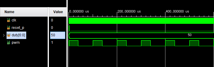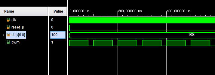 < Source, Period = 100usec, Duty ratio의 step = 128인 PWM을 control하는 Top Module >
