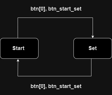- Set mode : Cooking Timer의 시작 시간을 세팅하는 모드 - btn[0]를 btn_start_set 버튼으로 지정하여 btn[0]에 의해 모드 전환이 발생하며, 이를 상태도로 표현하면 다음과 같다.