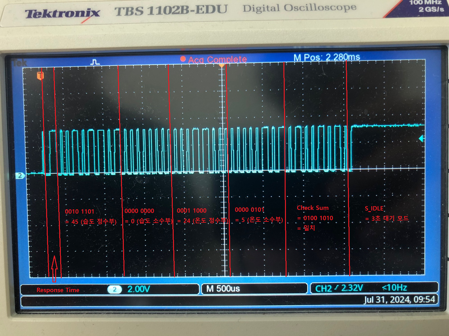 - 오실로스코프를 dht11_data 단자와 연결하여 위와 같은 파형을 얻을 수 있었으며, 위 파형은 DHT11과 Basys3간에 통신 신호를 나타내고 있다.