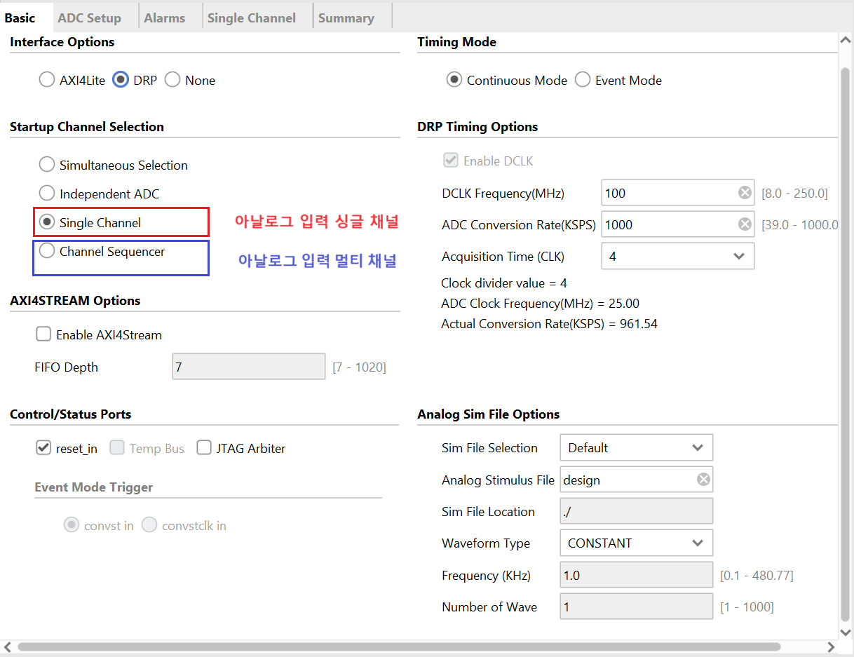1.2. Basys3는 XADC 기능을 지원하기 때문에 필요에 따라서 아날로그 입력 채널 갯수, 채널 번지 등을 설정하여