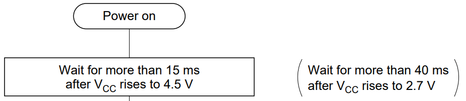 - LCD 디스플레이 데이터 시트에 의하면 LCD 모듈의 전원 안정화를 위해 15ms 이상을 기다릴 필요가 있음을 확인할 수 있다. 이는 LCD 모듈의 내부 회로가 정상적으로 작동하려면 안정된 전원 공급이 필요하기 때문이다.